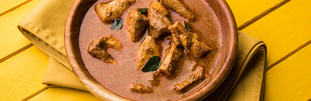 Fish simmer in a curry sauce with yogurt, tomatoes, onion, garlic, and ginger in this spicy Indian dish.